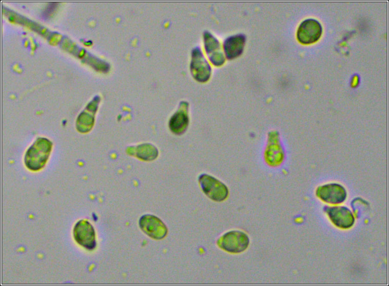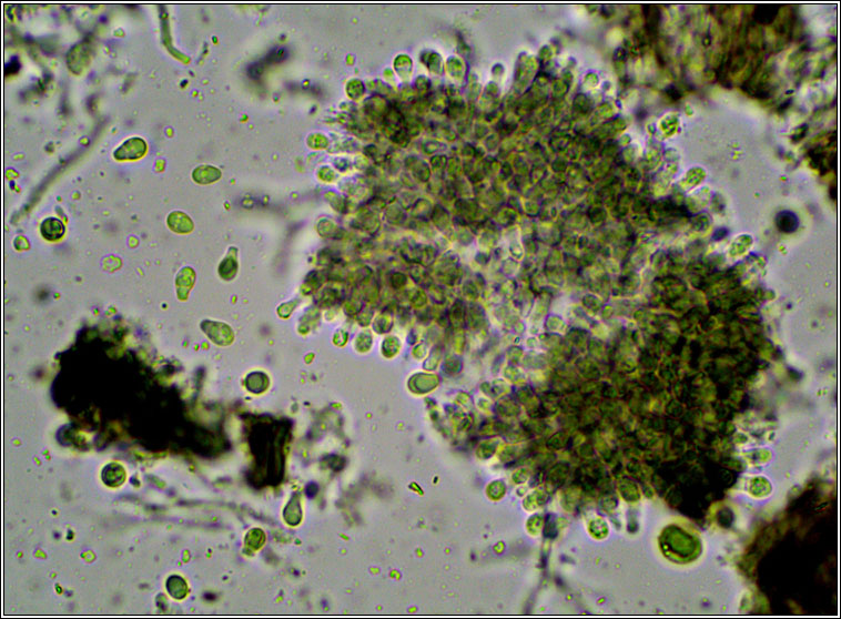 Q on Punctelia borreri Growth type lichenicolous Photographs on corticolous Punctelia borreri Conidia hyaline, 6-10 x 5-6 µm Micrographs below. |